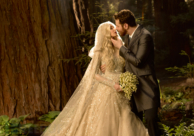 帕克夫妇的结婚照。他们的服装都是《指环王》服装设计师Ngila Dickson设计的,甜点桌由著名设计师Ken Fulk设计,整个婚宴非常之华丽。