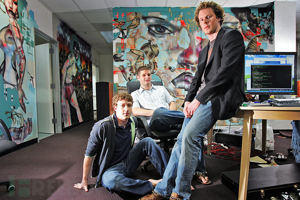 刚加入Facebook时,帕克(右)自说自话在CTO莫斯科维茨(中)的房间打了个地铺——没几天就被他女友赶出去了