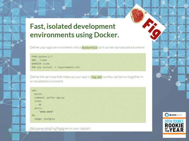 Fig为Docker的使用提供了一个快速的,分离的开发环境。Docker的移植只需要将配置信息放到一个简单的 fig.yml文件里。它会处理所有工作,包括构建、运行,端口转发,分享磁盘和容器链接。