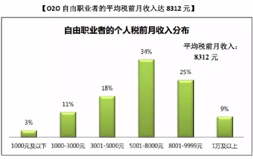 据赶集网调查发布的《2014年O2O自由职业者分析报告》报告显示,O2O自由职业者的平均税前月收入达8312元。税前个人月收入高于5000元的 O2O自由职业者占68%,9%的O2O自由职业者税前月收入超过一万元,低于3000元月收入的O2O自由职业者占14%。
